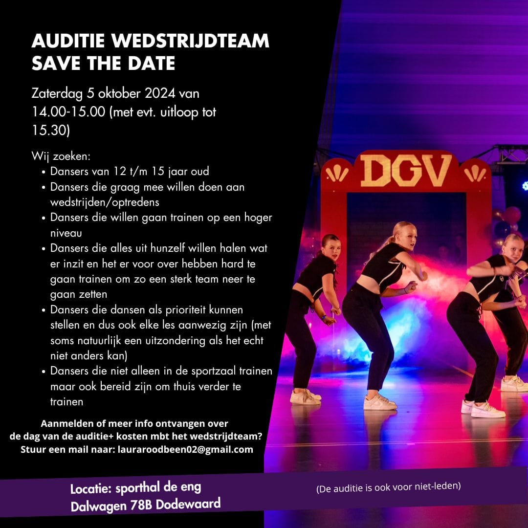 Vandaag zijn ook de DGV lessen weer begonnen. Er zijn een paar wijzigingen in de lessen/groepen en ook als je/je kind overgaat naar een andere groep kan dat betekenen dat de tijden van de lessen veranderen. Kijk voor meer informatie en het lesrooster in onze nieuwsbrief van 17 augustus of op onze website.